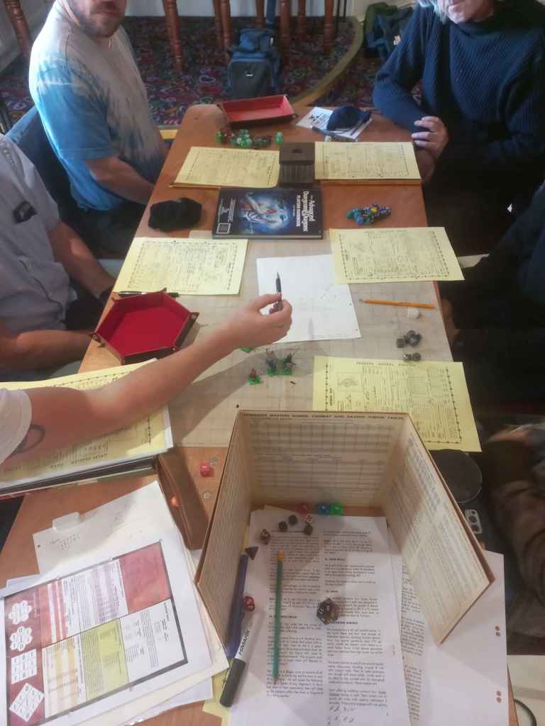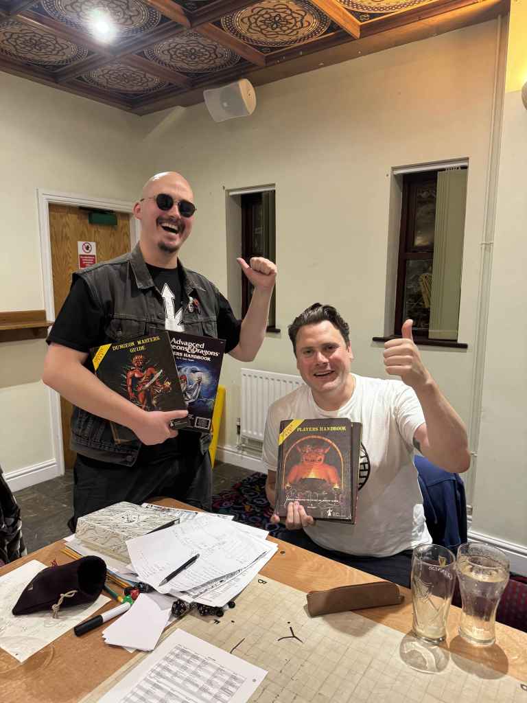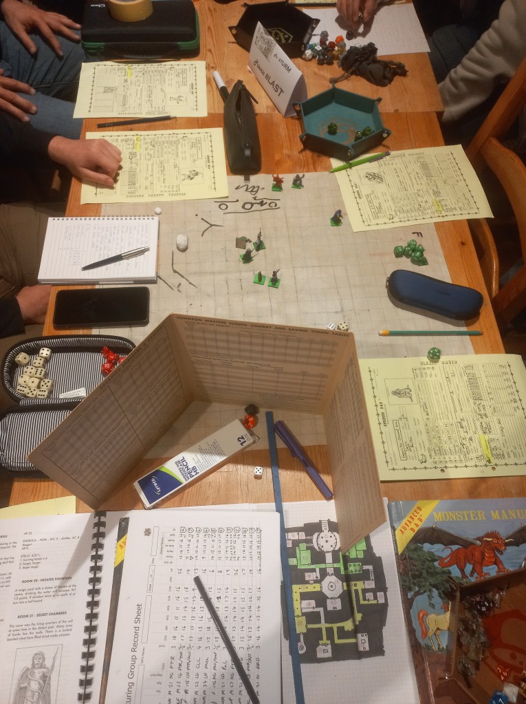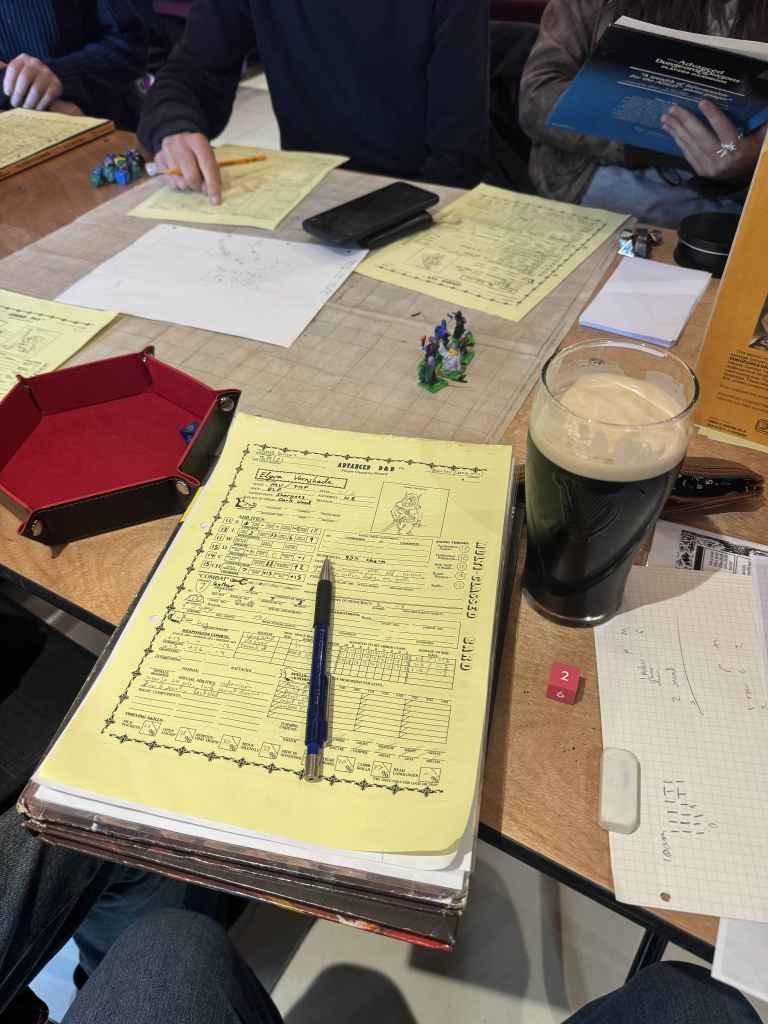 Eight brave souls turned up for Gabor Lux’s AD&D dungeon. We picked from pre-gen PCs; I chose a 4th-level Cleric and named him Osmund. Gabor outlined the dungeon’s history: once an imperial necropolis, long fallen to ruin, treasures still buried within. I loaded up on combat spells with a touch of utility.