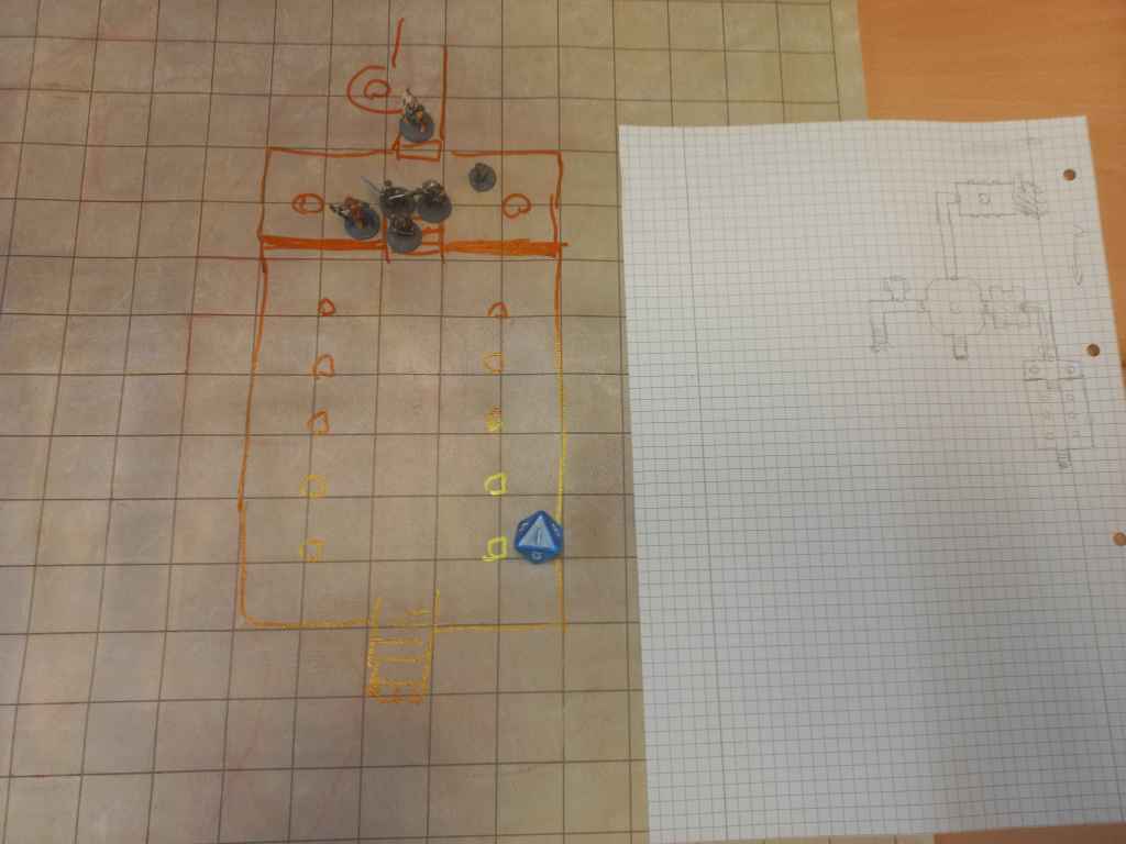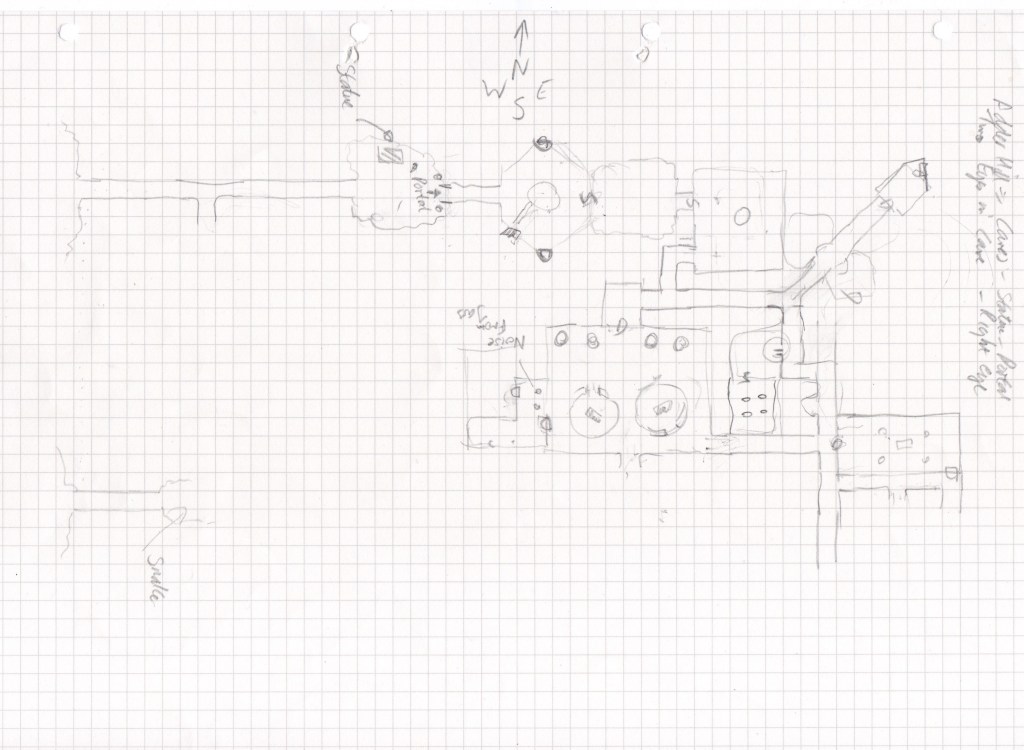 Wallace was a crossover from a previous game at the con (one of Grutzi’s, I believe)—an unexpected but welcome addition. After selecting spells and marching order, they descended into the caves. Bäxta mapped.