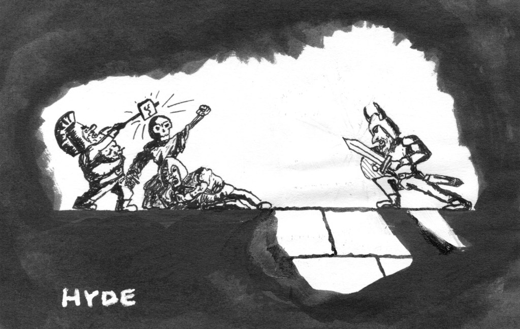 We set off and descended a pillared foyer where skeletal statues held out stony palms. GusB, our thief, dropped a few coins into one hand; the statue’s fist closed, and the coins vanished. We advance, underpaying apparently, because searing rays blasted from the statues’ eyes and frazzled us.