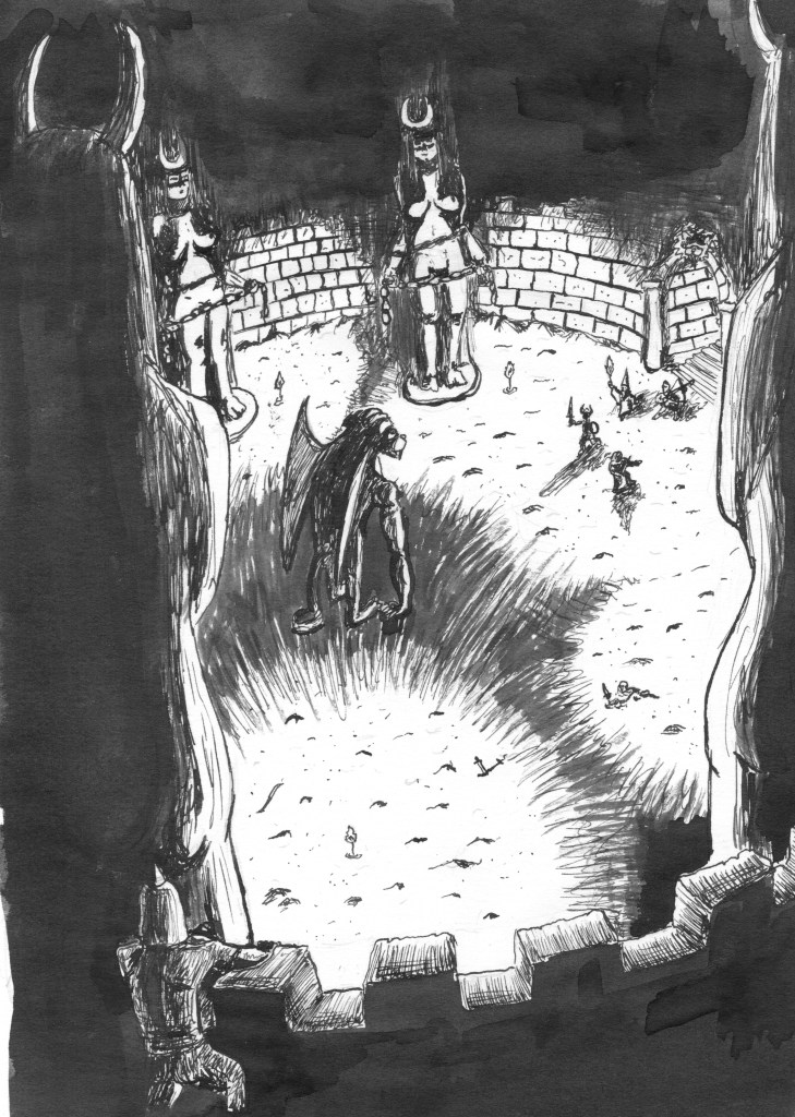 Below, a vast chamber opened, corridors yawning from every wall and a pit at its centre. Thirty feet down, our light caught shattered statuary. Our treasure map hinted at a “pit in the ceiling.” Gabor shrugged when asked him to clarify if this was so, so instead we trusted our gut and set about descending the pit.