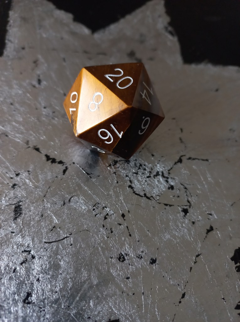 My brother and his partner bought this stone d20 for me for my birthday last year. I don’t usually splash out on things like this. They saw me checking it out at a stall during the UK Games Expo. I didn’t buy it, so they snuck around, bought it, and surprised me with it later on. A very lovely gift, and it rolls beautifully.